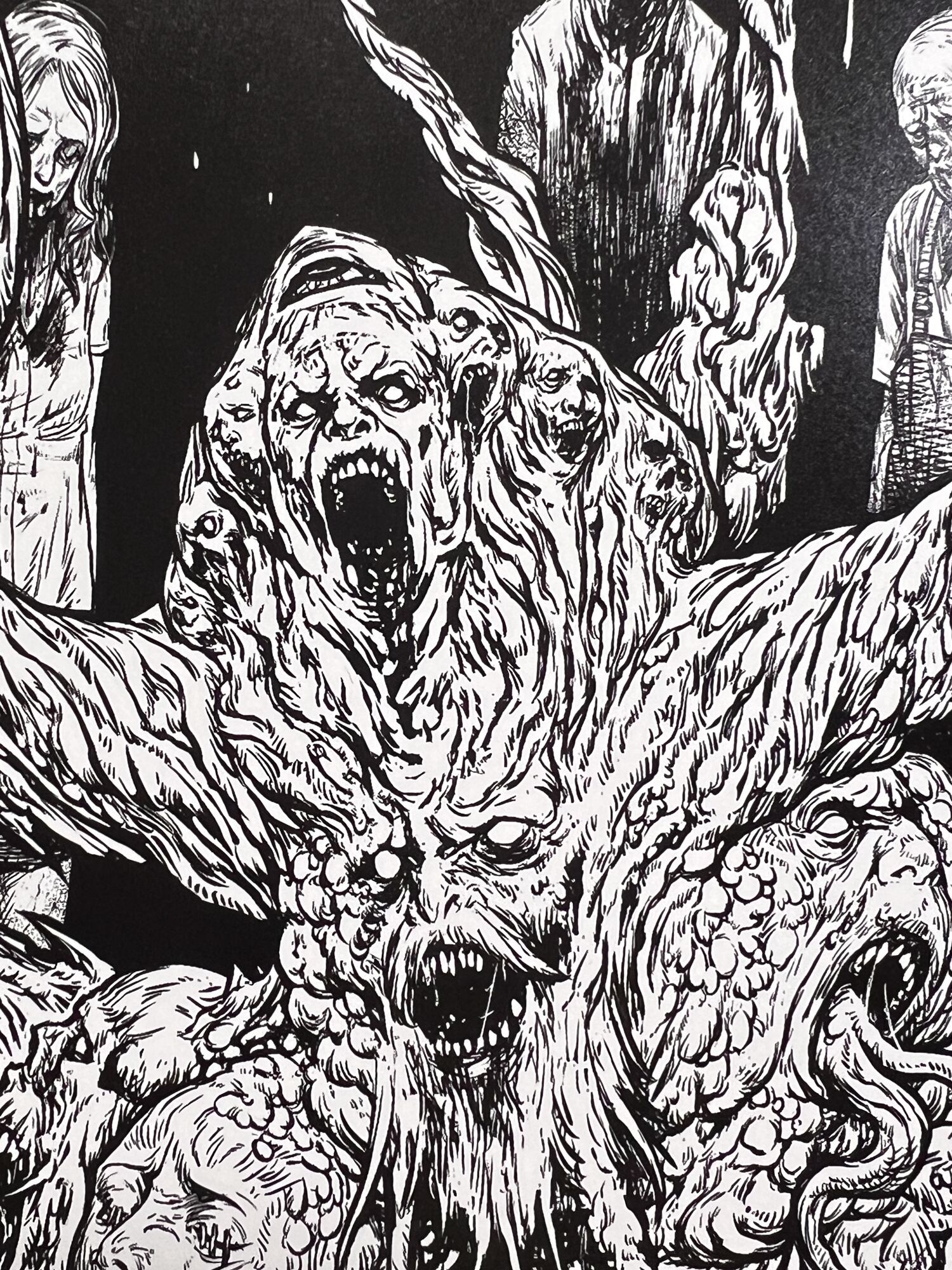 我々人間が人間であるがゆえに、逃れることのできない、善とも悪ともならない社会構造が存在する。従う者、死を選ぶ者、巨大な存在に自ら呑み込まれる者や同化する者など、救いようのない無慈悲な構図として描かれています。