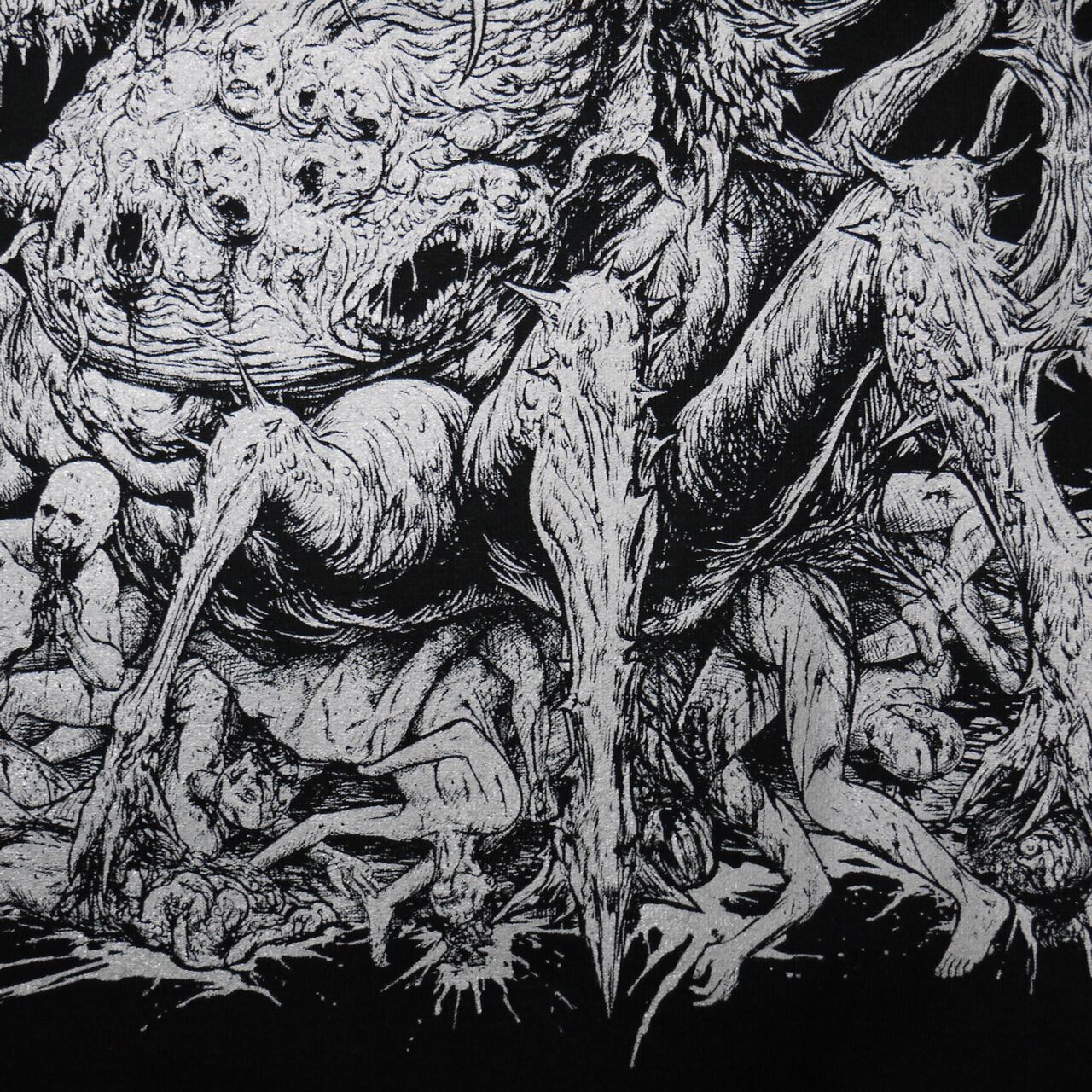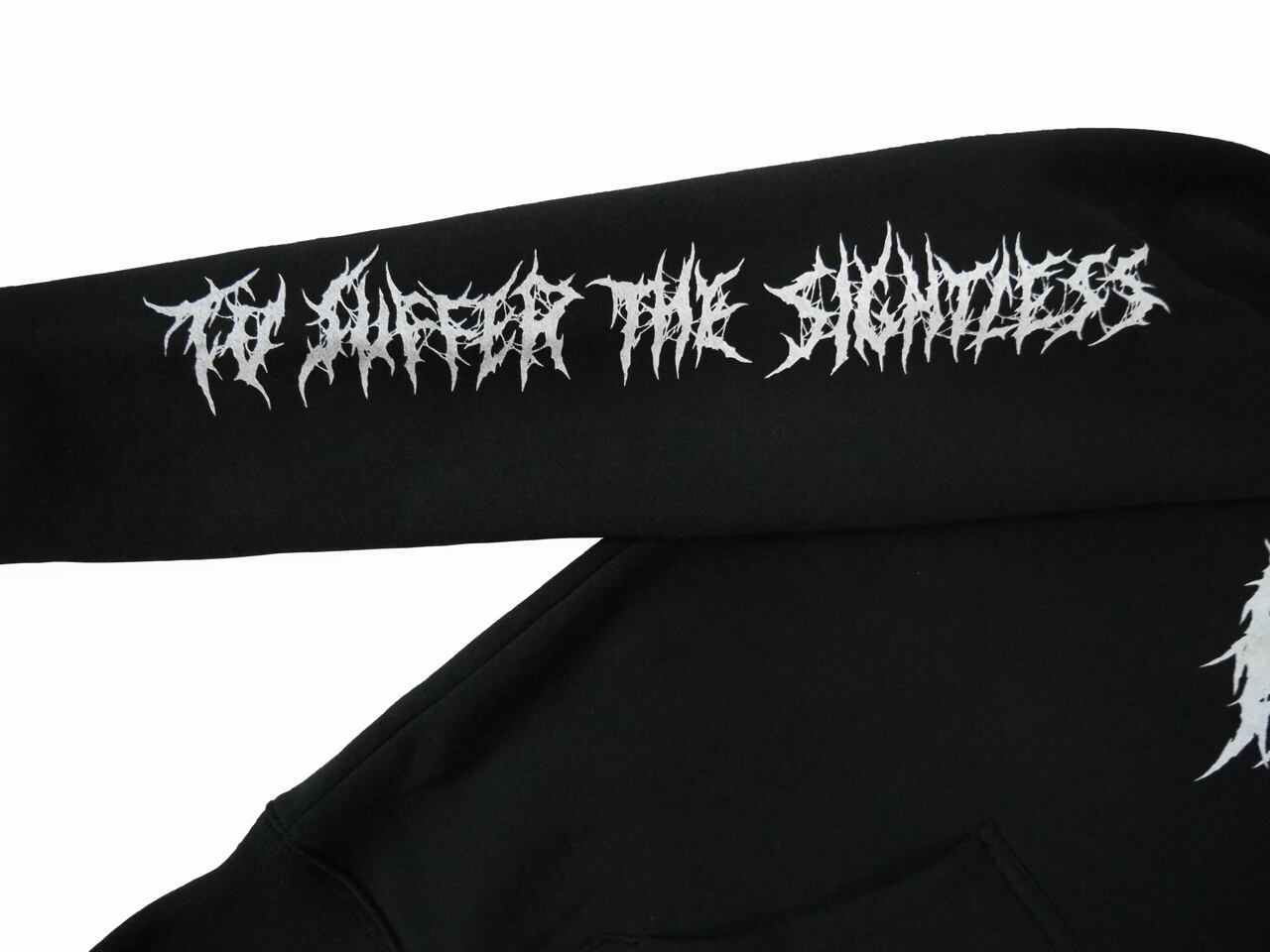 袖は二種類、左が定番の『BRUTAL DEATH CLOTHING』で、右が『TO SUFFER THE SIGHTLESS(目に見えない苦しみ)』 の描き下ろし文字デザイン。
